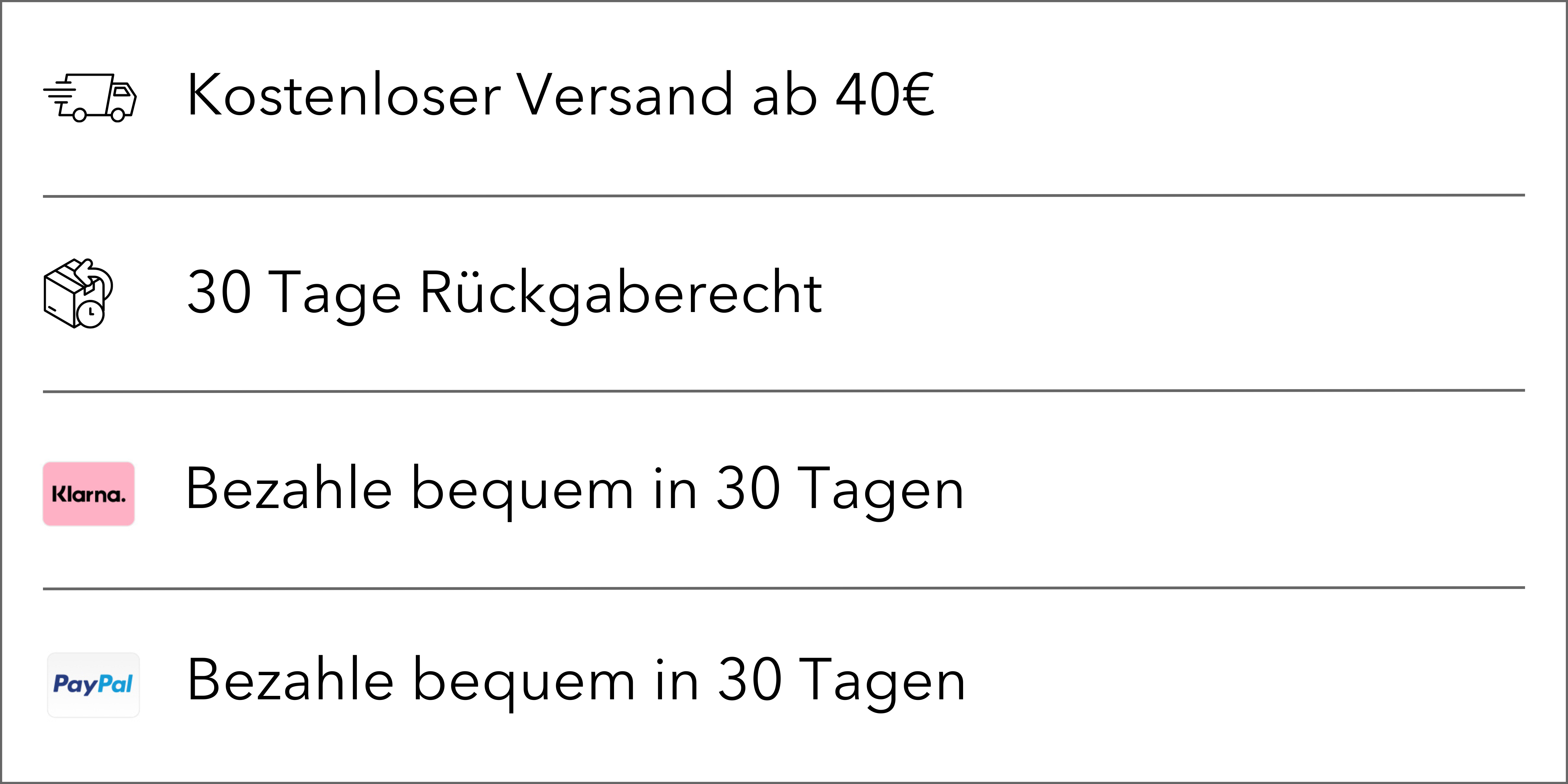 Für Lieferungen innerhalb Deutschlands ist der Versand ab einer Bestellsumme von 40€ kostenfrei. Der Standard Versand kostet innerhalb Deutschlands 2,90€